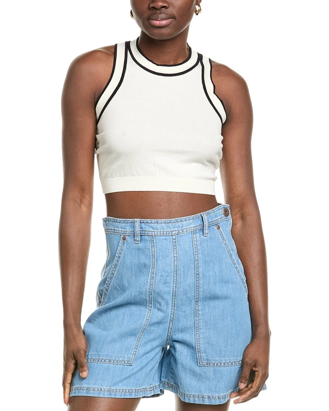 - About the brand: Feminine and sophisticated pieces with an undeniable Italian influence. - Sweater Tank in beige with contrast trim and ribbed hem - Approximately 15in from shoulder to hem - Model is 5'9 and is wearing a size small. Measurements may vary slightly by size. - 80% cotton, 20% polyester - Hand wash - Imported