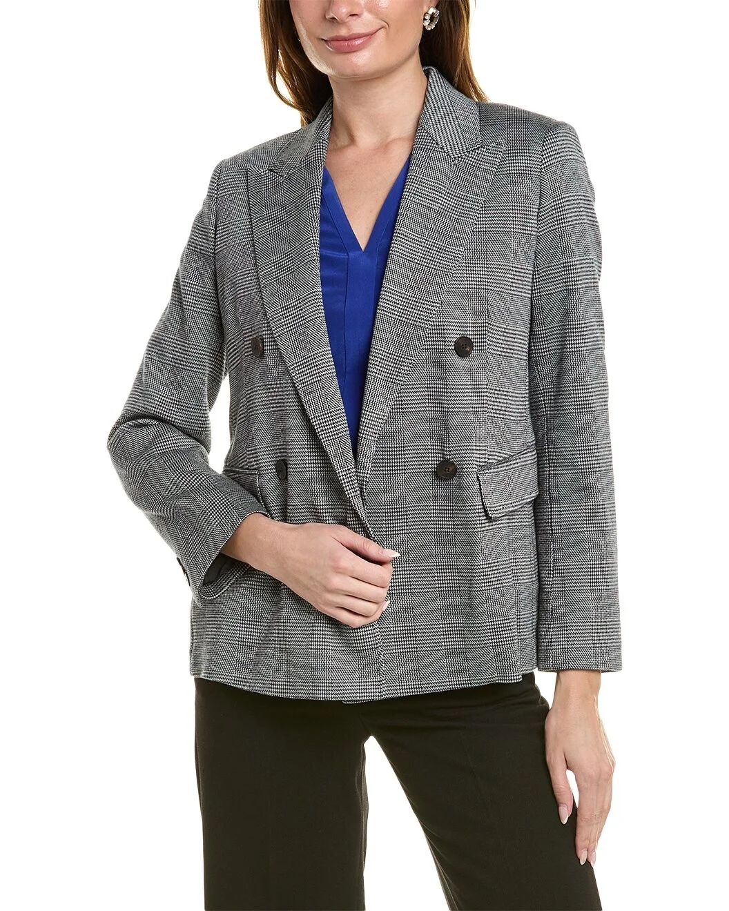 - Color/pattern: black and white - Approximately 24in from shoulder to hem - Model is 5'10 and is wearing a size 2. Measurements may vary slightly by size. - Design details: peak lapel, two front pockets, and center vent at back hem - Double-breasted button closure - Shell: 45% viscose, 44% cotton, 9% nylon, 2% elastane - Lining: 70% acetate, 30% polyester - Dry clean only - Imported