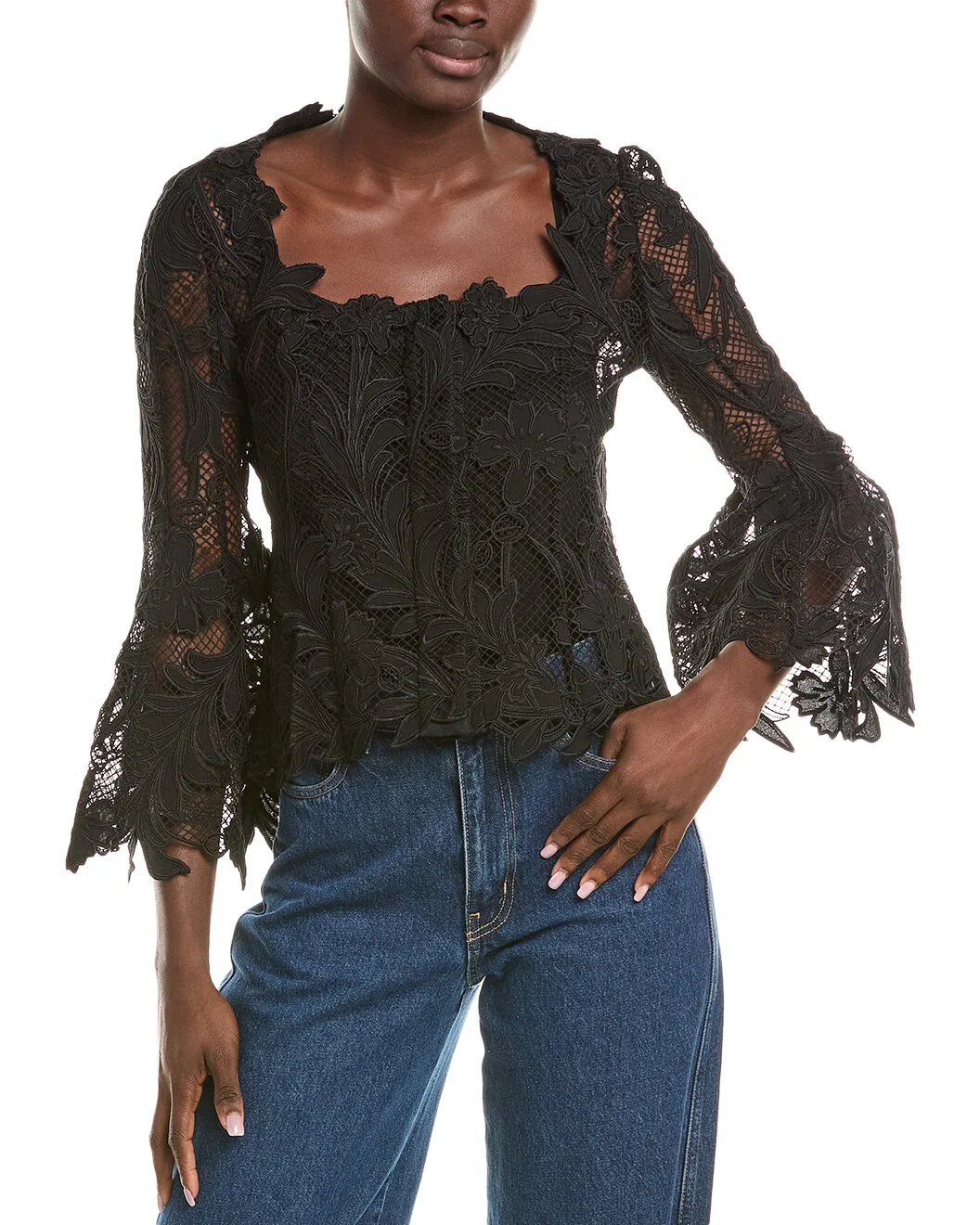 - About the brand: Feminine. Transcendent. Enduring. - Jacket in black with sheer lace construction and bell-sleeves - Approximately 22in from shoulder to hem - Model is 5'10 and is wearing a size 4. Measurements may vary slightly by size. - Snap front - 100% polyester - Dry clean only - Made in Italy - Our products are 100% genuine. In some cases we purchase merchandise from trusted independent suppliers and not directly from the brand owner. In all cases we stand by the authenticity of every product sold on our site.
