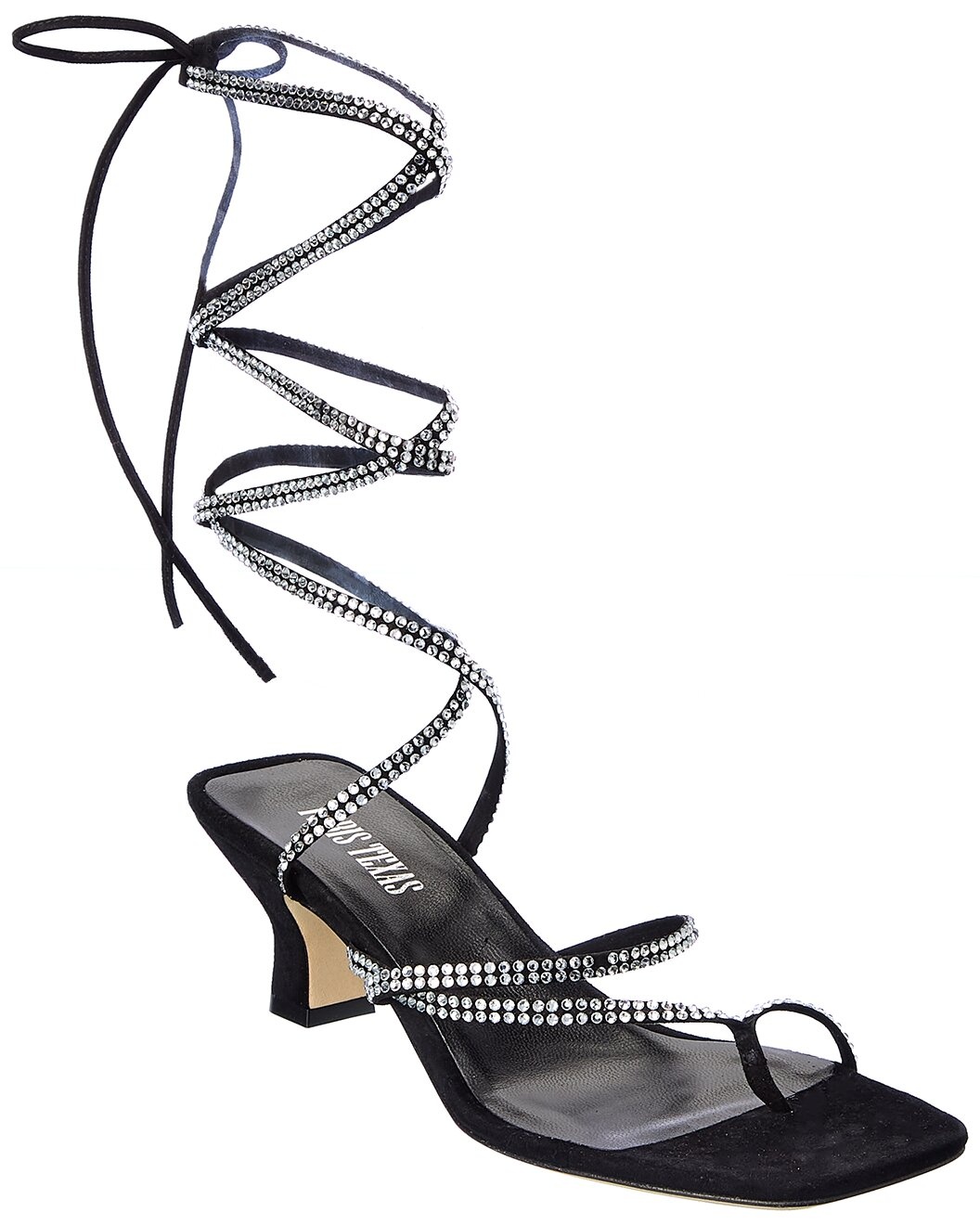 - About the brand: Bold designer footwear with contemporary Italian luxury. - Please note: Size selections are European. For US conversions, please reference size chart. - Holly Betty Suede Sandal in black suede with rhinestone embellishments - Self-tie ankle wrap closure - Lightly padded leather insole - Smooth leather sole - 2.5in heel - Please note: All measurements are approximate and were taken from a size 37; slight variations may occur. - Made in Italy