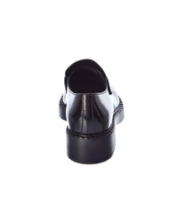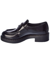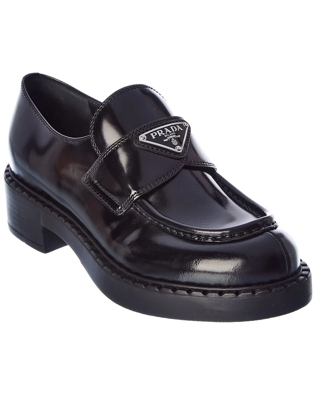 - About the brand: Classic, sporty, signature style from Italy. - Please note: Size selections are European. For US conversions, please reference size chart. - Made in Italy - Brushed Leather Loafer in black leather with polished steel logo triangle - Lightly padded leather insole - Rubber sole with traction - 1.6in heel - 0.75in platform - Please note: All measurements are approximate and were taken from a size 37; slight variations may occur. - Our products are 100% genuine. In some cases we purchase merchandise from trusted independent suppliers and not directly from the brand owner. In all cases we stand by the authenticity of every product sold on our site. - We are NOT an authorized dealer of this product.