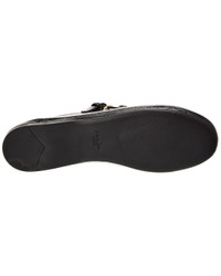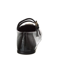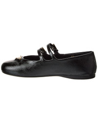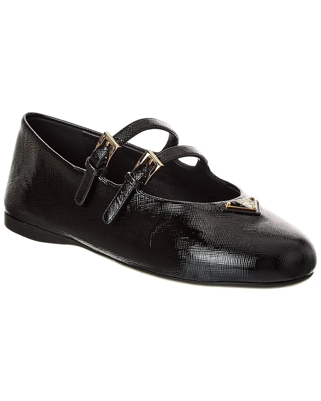 - About the brand: Classic, sporty, signature style from Italy. - Please note: Size selections are European. For US conversions, please reference size chart. - Made in Italy - Logo Saffiano Leather Flat in black saffiano leather and gold-plated hardware with triangle logo accent - Buckle closure - Lightly padded leather insole - Smooth man-made sole - Our products are 100% genuine. In some cases we purchase merchandise from trusted independent suppliers and not directly from the brand owner. In all cases we stand by the authenticity of every product sold on our site. - We are NOT an authorized dealer of this product.