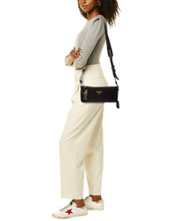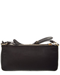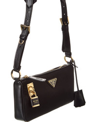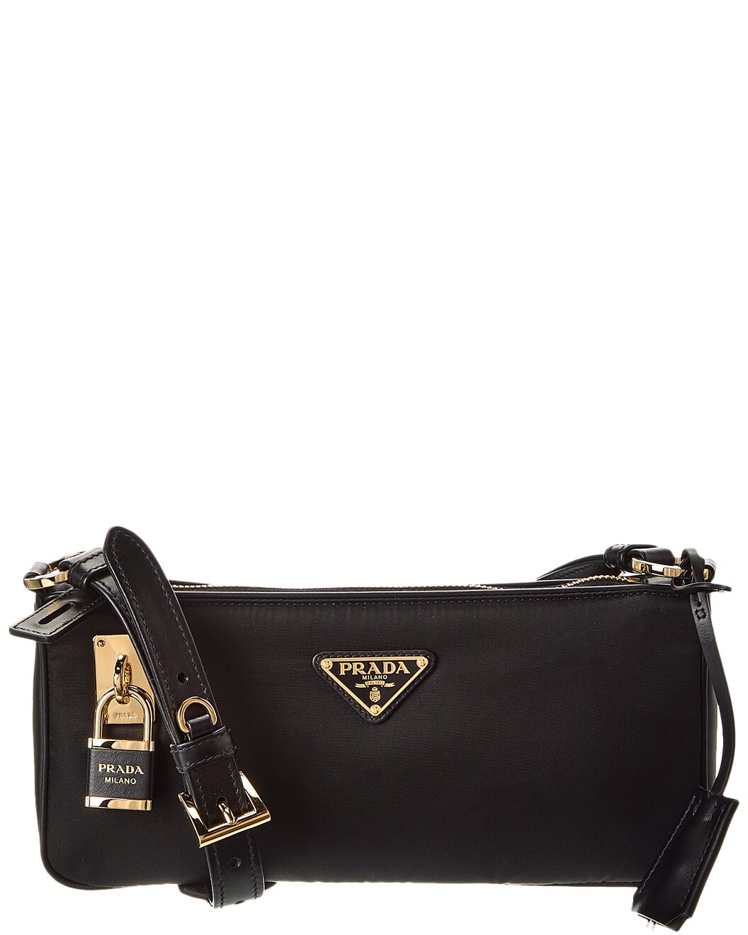 - About the brand: Classic, sporty, signature style from Italy. - Made in Italy - Small Re-Nylon & Leather Shoulder Bag in black re-nylon and leather and gold-plated hardware with triangle logo accent and padlock charm - Interior design details: printed fabric lining, zippered pocket - Measures 10.5in wide x 5in high x 1.5in deep - Adjustable and removable shoulder strap drops 22in - Zipper closure - Please note: All measurements were taken by hand and are approximate; slight variations may occur. - Our products are 100% genuine. In some cases we purchase merchandise from trusted independent suppliers and not directly from the brand owner. In all cases we stand by the authenticity of every product sold on our site. - We are NOT an authorized dealer of this product.