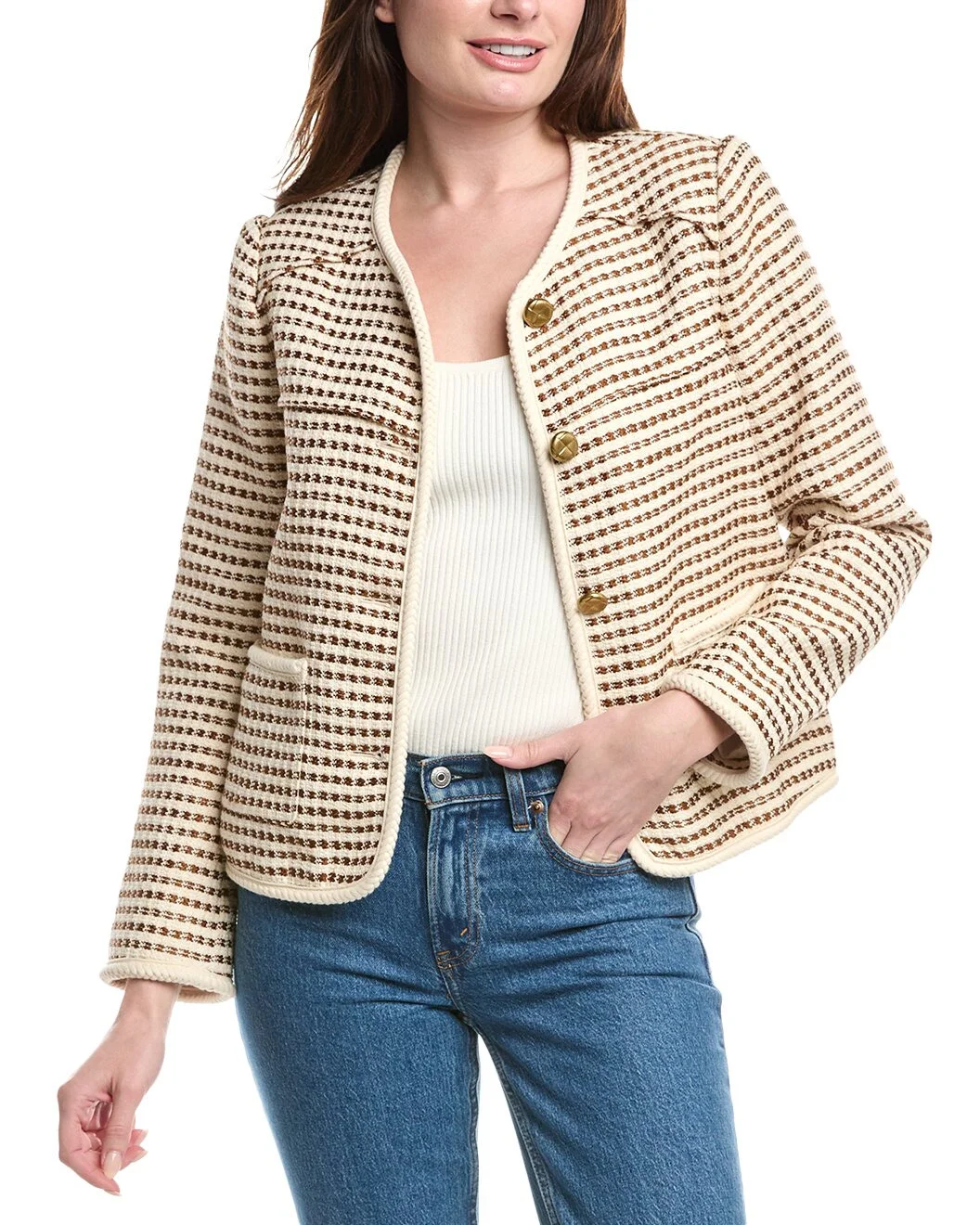 - About the brand: For more than twenty years, rag & bone has been committed to making timeless yet modern fashion with an understated edge. Inspired by New York with a strong focus on quality and comfort, every rag & bone style is distinctly original. - Mirabelle Tweed Jacket in ivory combo with front pockets - Approximately 23in from shoulder to hem - This item tends to run small (based on Member feedback). We recommend sizing up for your best fit. Model is 5'10.5 and is wearing a size small. Measurements may vary slightly by size. - Button front - Shell: 52% cotton, 29% polyester, 14% acrylic, 5% spandex - Lining: 51% viscose, 49% polyester - Dry clean only - Imported