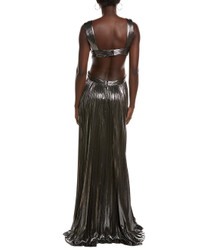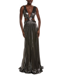 - Color/pattern: gunmetal - Approximately 65in from shoulder to hem - Model is 5'10 and is wearing a size small. Measurements may vary slightly by size. - Design details: V-neck, and cutout waist detail - Center back zip with hook-and-eye closure - 95% polyester, 5% spandex - Hand wash - Imported