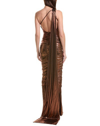 - Color/pattern: pecan - Approximately 60in from shoulder to hem - Model is 5'10 and is wearing a size small. Measurements may vary slightly by size. - Design details: pleated fabric, ruched front, and asymmetrical neck - Center back zip with hook-and-eye closure - 95% polyester, 5% spandex - Hand wash - Imported