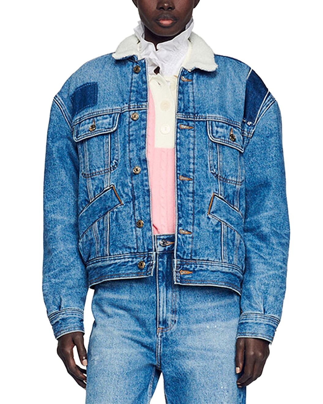 - About the brand: Parisian pieces through and through. - Denim Jacket in blue jean with faux fur collar and lining, four front pockets - Please note: Size selections are European. For US conversions, please reference the size chart. - Button front - Main: 100% cotton - Body Lining: 54% acrylic, 46% polyester - Sleeve Lining: 100% polyester - Pocket Lining: 65% polyester, 35% cotton - Padding: 100% polyester - Machine wash - Imported