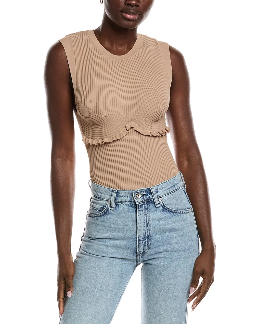 - About the brand: Parisian pieces through and through. - Knit Sweater Bodysuit in nude with crewneck, ruffle trim, and ribbed fabric - Approximately 26in from shoulder to hem - Model is 5'10 and is wearing a size 2. Measurements may vary slightly by size. - Snap gusset closure - 64% viscose, 20% polyamide, 14% polyester, 2% elastane - Hand wash - Imported