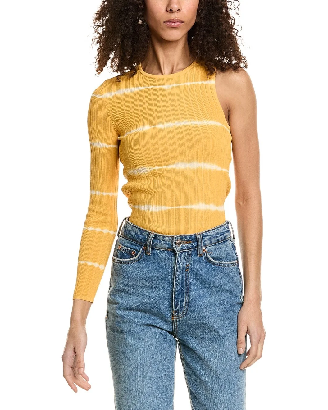 - About the brand: Parisian pieces through and through. - One-Sleeve Top in clementine with rib design - Approximately 24in from shoulder to hem - Model is 5'12 and is wearing a size 1. Measurements may vary slightly by size. - 63% viscose, 37% nylon - Hand wash - Imported