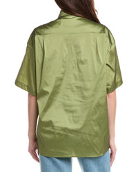 - About the brand: Parisian pieces through and through. - Shirt in kaki clair with right chest pocket and high-low hem - Approximately 30in from shoulder to hem - Model is 5'10.5 and is wearing a size 1. Measurements may vary slightly by size. - Snap closure - 64% polyester, 28% nylon, 8% elastane - Dry clean only - Imported