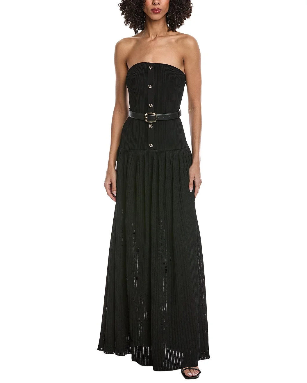 - Color/pattern: black - Approximately 58in from shoulder to hem - This item tends to run small (based on Member feedback). We recommend sizing up for your best fit. Model is 5'12 and is wearing a size small. Measurements may vary slightly by size. - Design details: ribbed knit, strapless neckline with inner gripping, faux button placket and belted waist - Slip-on styling - Upper: 54% viscose, 31% polyester, 14% polyamide, 1% elastane - Lower: 73% viscose, 17% polyamide, 10% polyester - Belt: 100% cow leather - Dry clean only - Imported