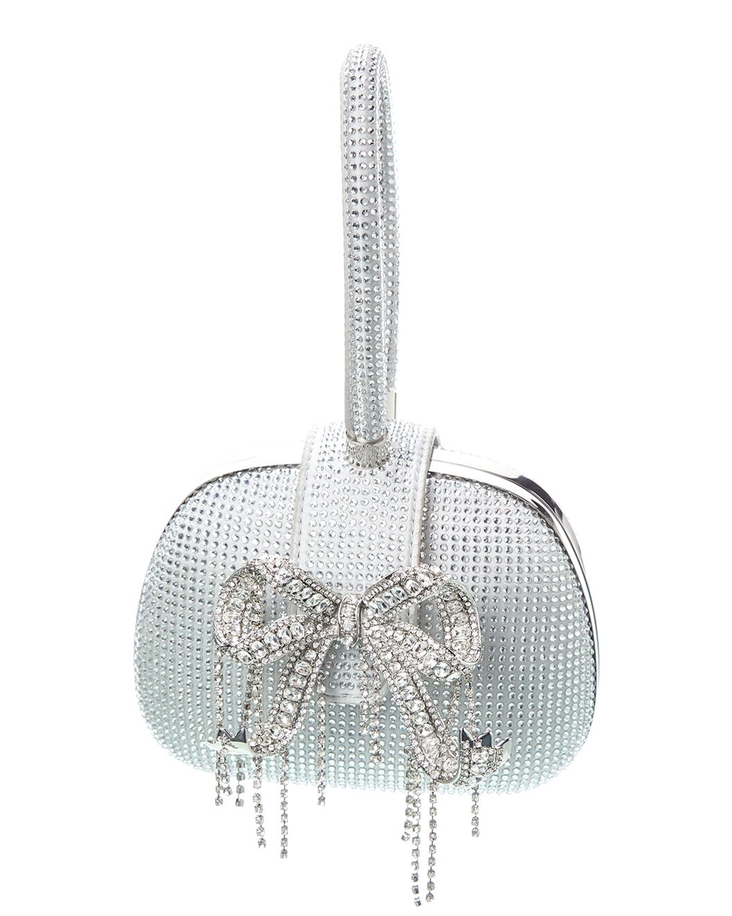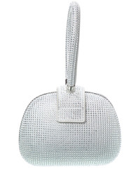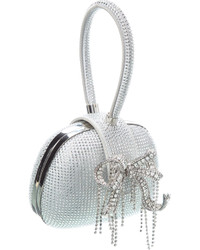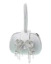 - Color/material: silver satin and metal - Design details: silver-tone hardware, rhinestone embellishments and fringe - Interior design details: satin lining, wall pocket - Measures 5.5in wide x 4.5in high x 3in deep - Top handle drops 5in - Fold-over flap with magnetic closure - Imported - Please note: All measurements were taken by hand and are approximate; slight variations may occur.