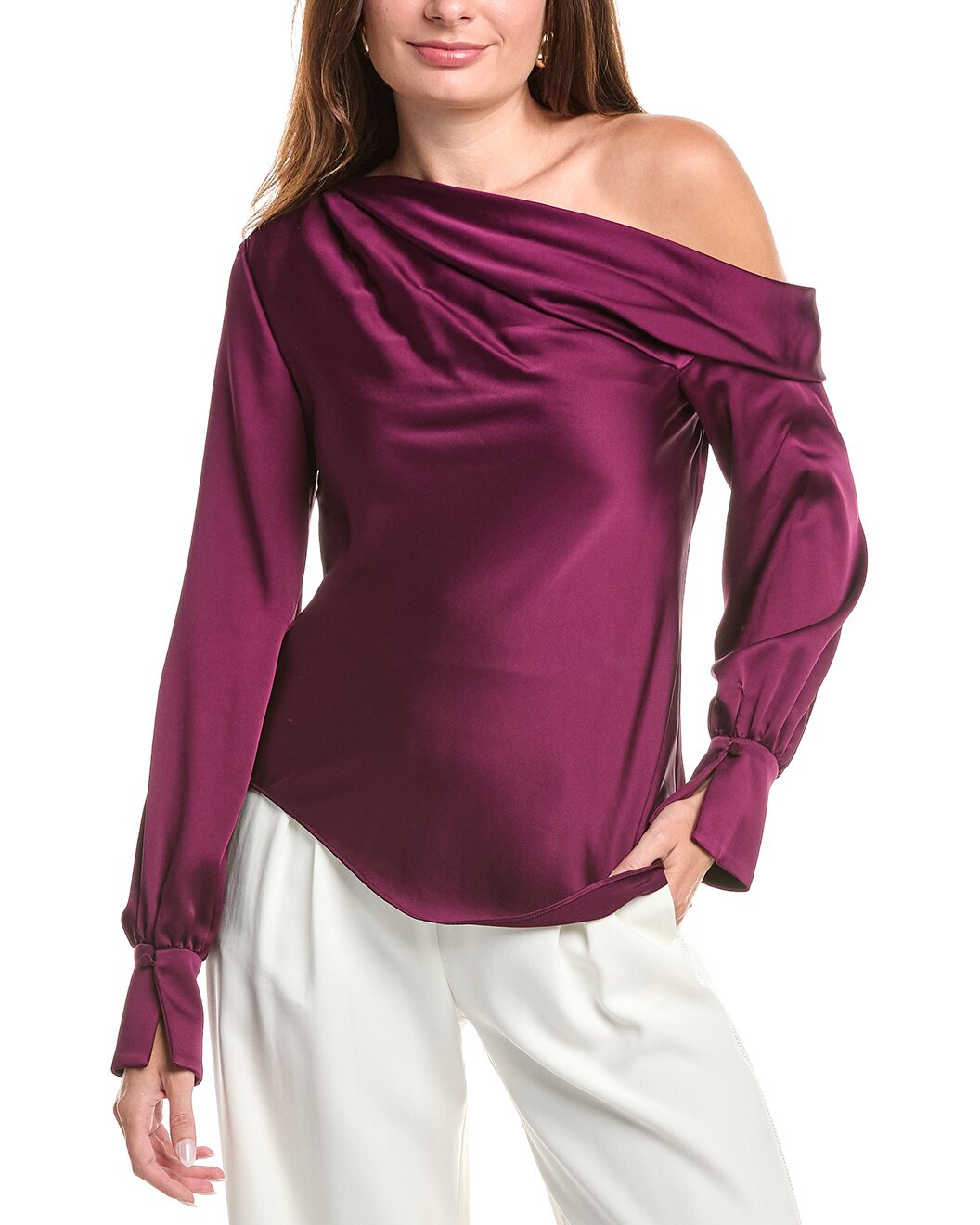 - Color/pattern: acai - Approximately 24in from shoulder to hem - Model is 5'10.5 and is wearing a size small. Measurements may vary slightly by size. - Design details: fold-over one-shoulder neckline and split button cuffs - 89% acetate, 11% polyester - Dry clean only - Imported