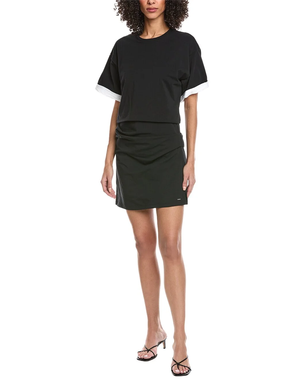 - Color/pattern: black - Approximately 35in from shoulder to hem - Model is 5'12 and is wearing a size M. Measurements may vary slightly by size. - Design details: kimono sleeves and ruched waist and skirt - Slip-on styling - Self 1: 85% cotton, 5% elastane - Contrast: 100% cotton - Hand wash - Imported