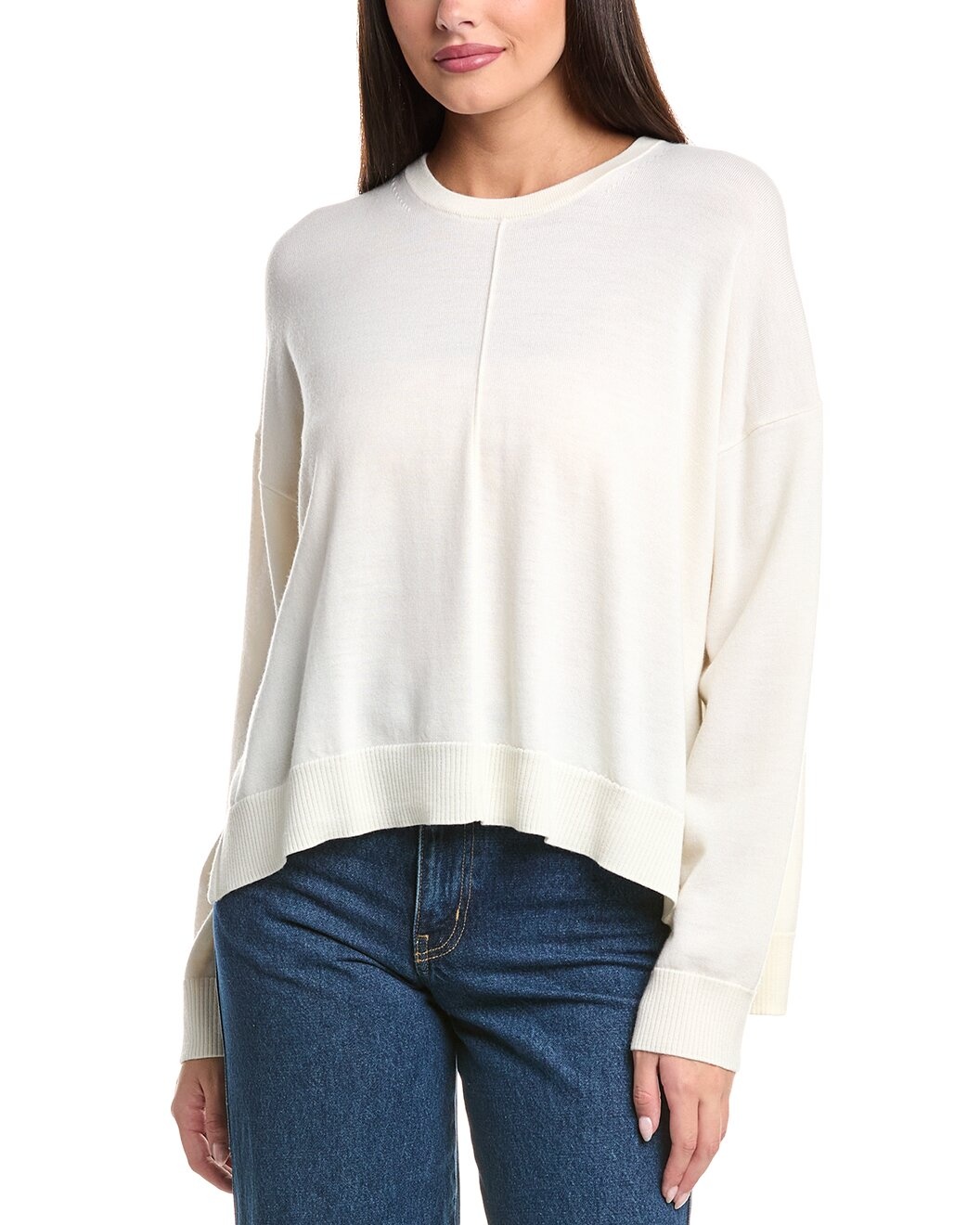 - Color/pattern: ivory - Approximately 25in from shoulder to hem - Model is 5'9 and is wearing a size small. Measurements may vary slightly by size. - Design details: ribbed trim an d high-low hem with side slits - 100% Merino wool - Dry clean only - Imported
