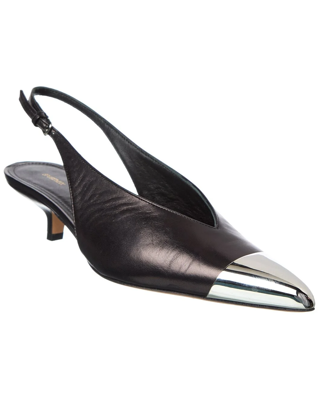 - Please note: Size selections are European. For US conversions, please reference size chart. - Color/material: black leather - Design details: silver-tone hardware, metal pointy-toe - Adjustable ankle strap with buckle closure - Lightly padded leather insole - Smooth leather sole - 2.5in heel - Please note: All measurements are approximate and were taken from a size 37; slight variations may occur. - Made in Italy