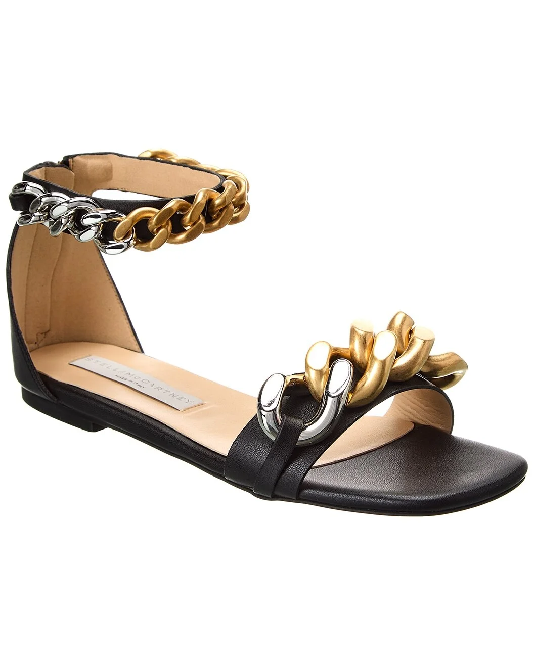 - About the brand: Sharp. Sophisticated. Sustainable. - Please note: Size selections are European. For US conversions, please reference size chart. - Made in Italy - Falabella Chain Sandal in black vegan-friendly faux leather and silver-tone and gold-tone hardware with chain trim - Center back zip-up closure - Lightly padded leather insole - Smooth leather sole - Our products are 100% genuine. In some cases we purchase merchandise from trusted independent suppliers and not directly from the brand owner. In all cases we stand by the authenticity of every product sold on our site. - WARNING: - CA Residents - Prop 65