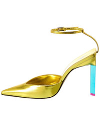 - Please note: Size selections are European. For US conversions, please reference size chart. - Made in Italy - Color/material: gold leather - Design details: silver-tone hardware, metallic heel and pointy-toe - Adjustable ankle strap with buckle closure - Lightly padded leather insole - Smooth leather sole - 4in heel - Please note: All measurements are approximate and were taken from a size 37; slight variations may occur. - Our products are 100% genuine. In some cases we purchase merchandise from trusted independent suppliers and not directly from the brand owner. In all cases we stand by the authenticity of every product sold on our site.