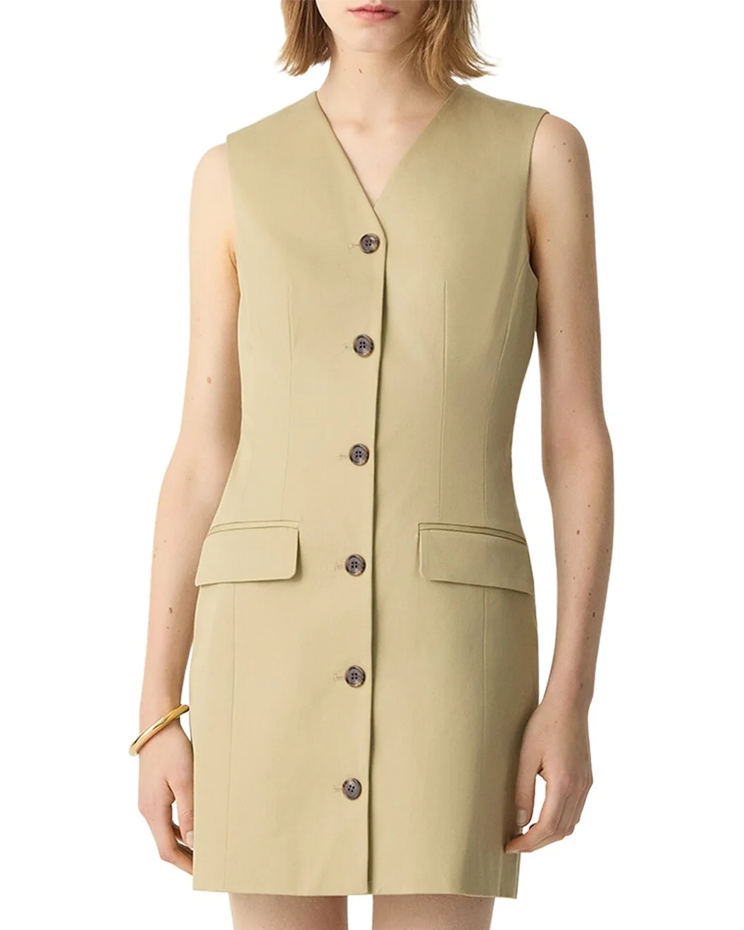 - About the brand: Theory believes the perfect outfit can change the way you feel. For over 25 years, Theory has developed innovative fabrics and highly functional pieces that feel great and fit perfectly. Theory's seasonal collections are versatile, expertly tailored and easy-to wear. - Blazer Dress in trench - A minimal sleeveless single breasted blazer dress that is collarless with a sculpted silhouette. - Button front - 98% Cotton, 2% Elastane - Dry clean only - Imported
