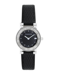 - About the brand: Timeless beauty and superior craftsmanship - a jewelry icon. - Circa 2000s - This is an authentic, pre-loved Tiffany & Co. piece. It's possible that there may be some gentle wear. - Quartz movement - Generic Black leather strap - Pin buckle clasp - Stainless Steel bezel - Stainless Steel case - Sapphire crystal - Push down crown - Black dial - Case: 25mm - Bracelet/strap: 13mm wide x 7in long - Manufacturer's limited warranty - Independent Appraisal and Generic Box - The Watch Size Guide