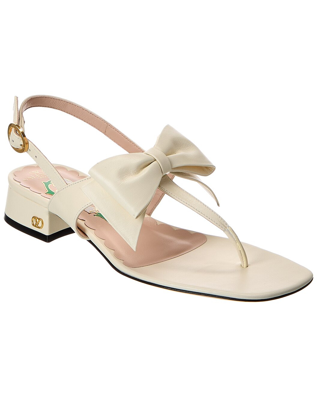 - About the brand: Signature elegance with a modern aesthetic. - Please note: Size selections are European. For US conversions, please reference size chart. - Based on feedback from Members, this brand typically runs small. We suggest sizing up a half size for most styles. - Made in Italy - Bow 25 Leather Sandal in white leather and gold-tone hardware with Vlogo accent - Adjustable ankle strap with buckle closure - Lightly padded leather insole - Smooth leather sole - 1in heel - Please note: All measurements are approximate and were taken from a size 36; slight variations may occur. - Our products are 100% genuine. In some cases we purchase merchandise from trusted independent suppliers and not directly from the brand owner. In all cases we stand by the authenticity of every product sold on our site.