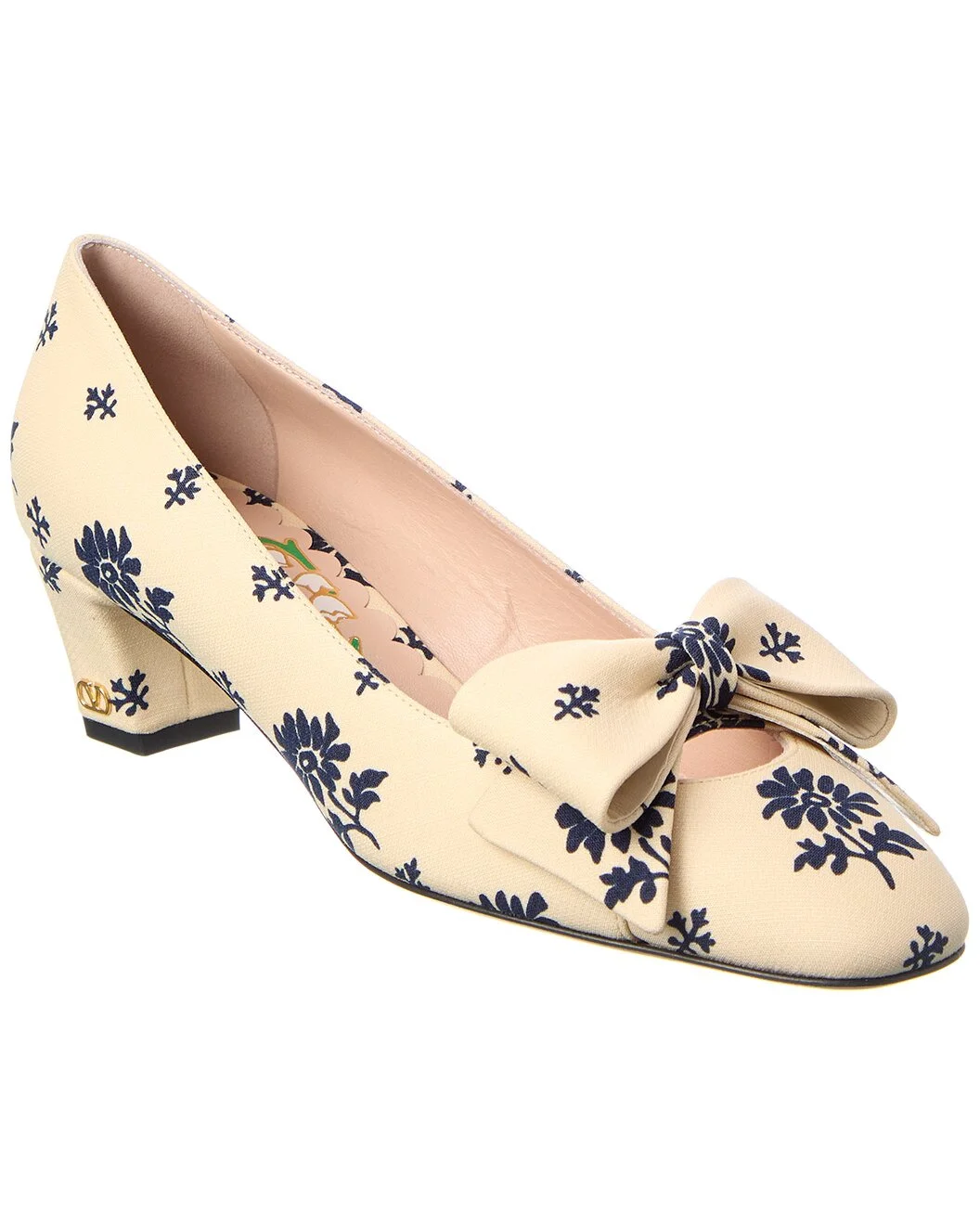 - About the brand: Signature elegance with a modern aesthetic. - Please note: Size selections are European. For US conversions, please reference size chart. - Based on feedback from Members, this brand typically runs small. We suggest sizing up a half size for most styles. - Made in Italy - Bowow Decollete Canvas Pump in ivory and navy printed canvas and gold-tone hardware with bow detail and VLogo at heel - Lightly padded leather insole - Smooth leather sole - 2in heel - Please note: All measurements are approximate and were taken from a size 37; slight variations may occur. - Our products are 100% genuine. In some cases we purchase merchandise from trusted independent suppliers and not directly from the brand owner. In all cases we stand by the authenticity of every product sold on our site.