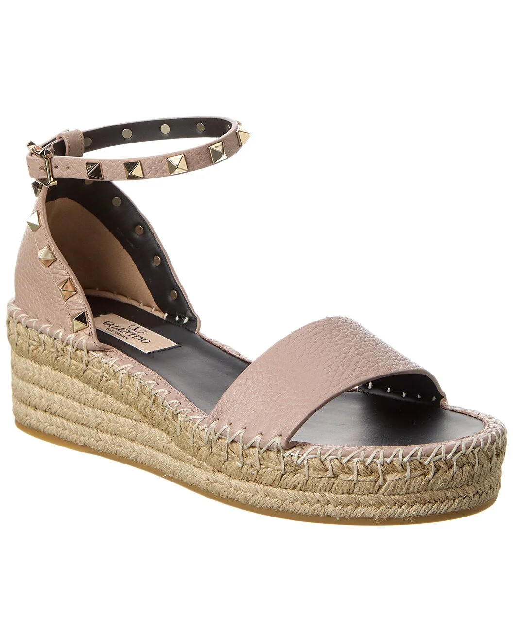 - About the brand: Signature elegance with a modern aesthetic. - Please note: Size selections are European. For US conversions, please reference size chart. - Based on feedback from Members, this brand typically runs small. We suggest sizing up a half size for most styles. - Made in Italy - Rockstud 55 Grainy Leather Platform Sandal in nude grainy leather with platinum-finish rockstuds and braided rope wedge - Adjustable ankle strap with buckle closure - Smooth leather insole - Smooth man-made sole - 2in heel - 1in platform - Please note: All measurements are approximate and were taken from a size 37; slight variations may occur. - Our products are 100% genuine. In some cases we purchase merchandise from trusted independent suppliers and not directly from the brand owner. In all cases we stand by the authenticity of every product sold on our site.