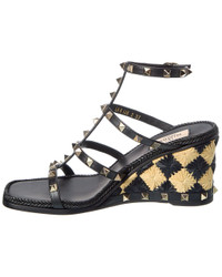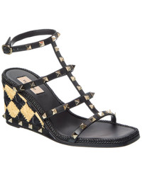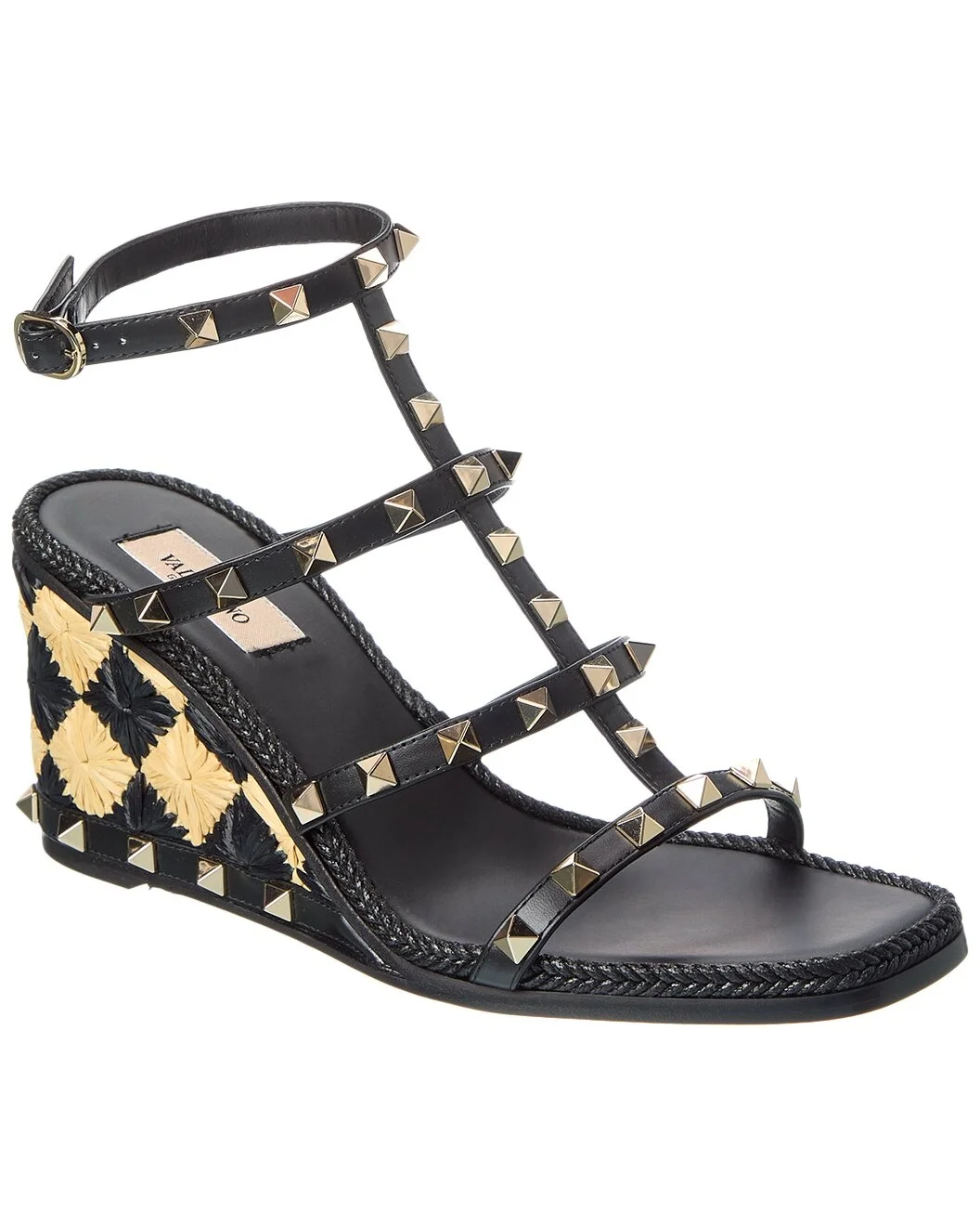 - About the brand: Signature elegance with a modern aesthetic. - Please note: Size selections are European. For US conversions, please reference size chart. - Based on feedback from Members, this brand typically runs small. We suggest sizing up a half size for most styles. - Made in Spain - Rockstud Caged 90 Leather Ankle Strap Wedge Sandal in black leather with platinum-finish rockstuds and woven straw wedge - Adjustable ankle strap with buckle closure - Lightly padded leather insole - Smooth leather sole - 3.5in heel - Please note: All measurements are approximate and were taken from a size 37; slight variations may occur. - Our products are 100% genuine. In some cases we purchase merchandise from trusted independent suppliers and not directly from the brand owner. In all cases we stand by the authenticity of every product sold on our site.