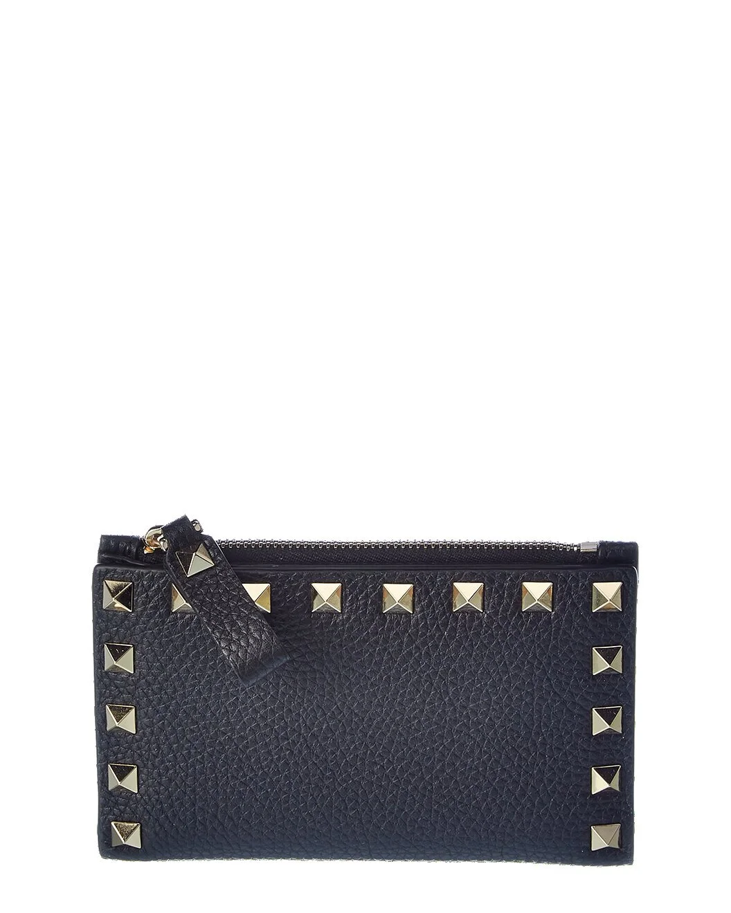 - About the brand: Signature elegance with a modern aesthetic. - Made in Italy - Rockstud Leather Card Case in black grainy leather with platinum-finish rockstuds and zippered pocket - Interior design details: leather and fabric lining, card slots - Measures 5.5in wide x 3.5in high x 1in wide - Fold-over flap with snap closure - Please note: All measurements were taken by hand and are approximate; slight variations may occur. - Our products are 100% genuine. In some cases we purchase merchandise from trusted independent suppliers and not directly from the brand owner. In all cases we stand by the authenticity of every product sold on our site.