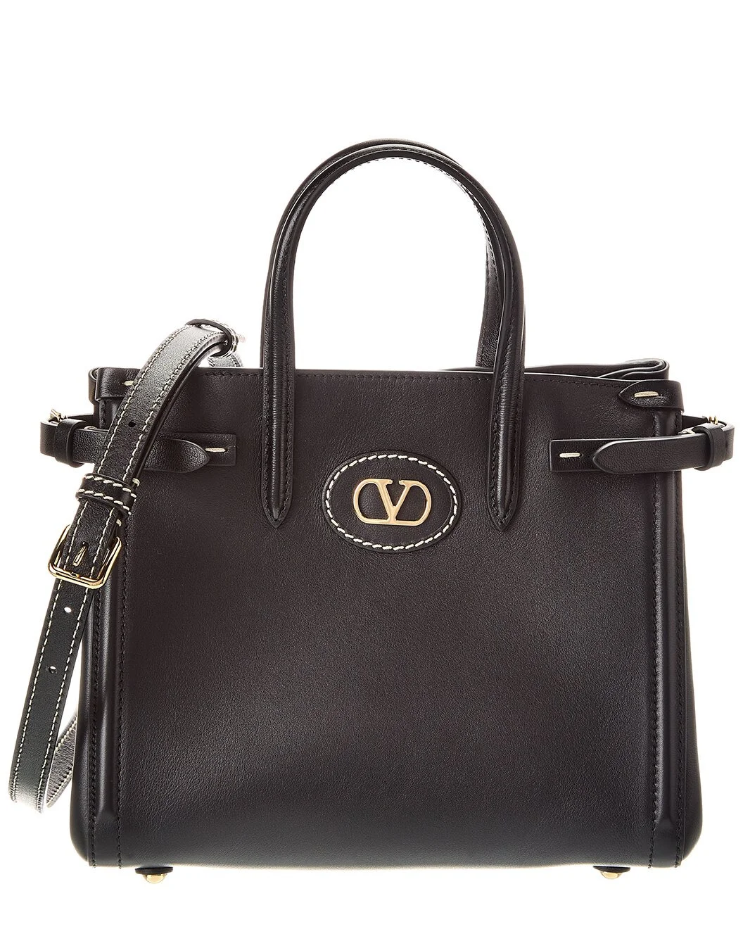 - About the brand: Signature elegance with a modern aesthetic. - Made in Italy - VLogo Small Leather Tote in black leather and gold-tone hardware with VLogo accent and contrast stitching - Interior design details: suede lining, zippered pocket - Measures 9.5in wide x 7.5in high x 5.5in deep - Top handles drop 4in - Adjustable and removable shoulder strap drops 26in - Magnetic closure - Protective feet at bottom - Please note: All measurements were taken by hand and are approximate; slight variations may occur. - Our products are 100% genuine. In some cases we purchase merchandise from trusted independent suppliers and not directly from the brand owner. In all cases we stand by the authenticity of every product sold on our site.