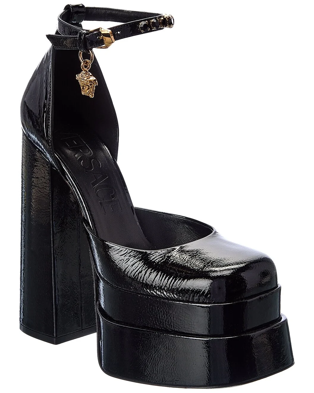 - About the brand: More is more. Bold, sexy & glamorous style from Italy. - Please note: Size selections are European. For US conversions, please reference size chart. - Made in Italy - Medusa Patent Platform Pump in black patent leather and gold-tone hardware with Medusa head logo charm and double platform - Adjustable ankle strap with buckle closure - Lightly padded leather insole - Smooth leather sole - 6.5in heel - 2.5in platform - Please note: All measurements are approximate and were taken from a size 38; slight variations may occur. - Our products are 100% genuine. In some cases we purchase merchandise from trusted independent suppliers and not directly from the brand owner. In all cases we stand by the authenticity of every product sold on our site.