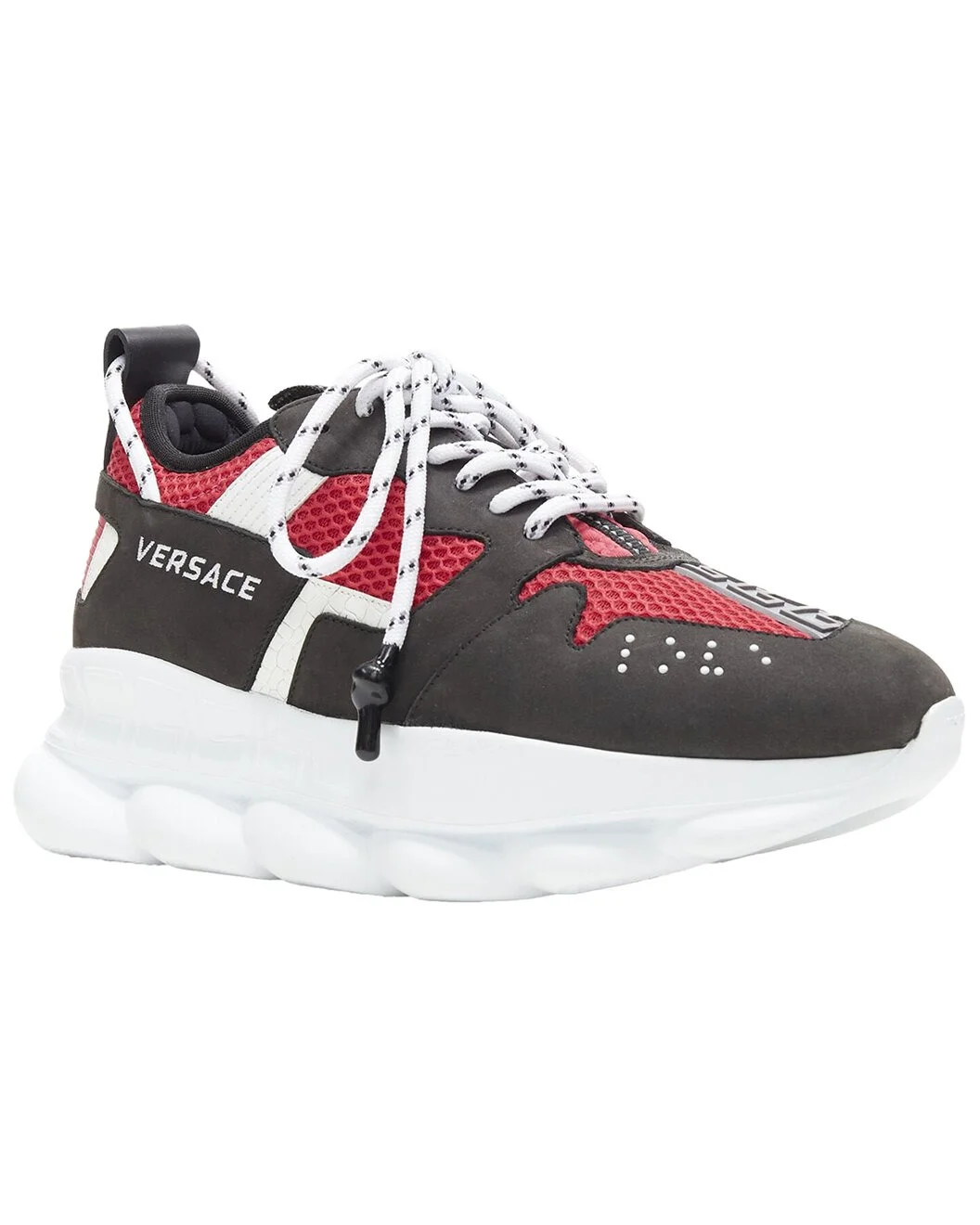 - About the brand: More is more. Bold, sexy & glamorous style from Italy. - This is an authentic, pre-loved piece. This item is in excellent condition, but may show slight signs of wear. This item shows unused or used once, but as good as new. no sign of wear. - For more information on condition, please see our condition guide at the bottom - Color/material: black cotton - Design details: new VERSACE Chain Reaction black suede fuschia red low chunky sneaker EU37 US7Reference: TGAS/A06297Brand: VersaceDesigner: Donatella VersaceModel: Versace Chain ReactionCollection: RunwayMaterial: Fabric, LeatherColor: Black, RedPattern: SolidClosure: Lace UpLining: FabricExtra Details: Signature Chain Reaction silhouette by Versace. Embodies the strongest elements of the Versace identity. Characterized by a lightweight, chain-linked rubber sole that takes inspiration from Versace chain jewellery. Rubber dipped laces. Chain link outsole. Braille 'love' lettering. Top stitch. Cupped insole. Central Greek Key print. Mid foot Greca Cage. Rubber Chain Reaction logo on upper tongue. Mesh accents on upper with Calf Leather trims. Rubber Sole. Made in Italy-DST030G D37TG DNF. Deadstock sneaker. The Chain Reaction sneaker embodies the strongest elements of the Versace identity. Eclectic details create a one-of-a-kind shoe characterized by a lightweight, chain-linked rubber sole that takes inspiration from Versace chain jewellery. Other signature elements include the iconic Greek Key pattern, the 'Chain Reaction' logo patch and braille 'love' lettering expressing the concept that love is blind.Estimated Retail Price: USD 1100Made in: ItalyCONDITION:Condition: New without tags. Comes with: Authenticity card. Designer tags. One dust bag. Order will NOT be shipped with original box, but the original box is available if shipping cost is paid separately. Please contact us directly to get a shipping quote with box. SIZINGDesigner size: EU37Size reference: EU37 / US7 / UK4 / JP24.5MEASUREMENTS: Heel height: 5cm / 2"Measurments: height: 50 mm - Please note: All measurements were taken by hand and are approximate; slight variations may occur. - Available only in Women's size 37.5 - The Pre-Loved Condition Guide - Our products are 100% genuine. In some cases we purchase merchandise from trusted independent suppliers and not directly from the brand owner. In all cases we stand by the authenticity of every product sold on our site.
