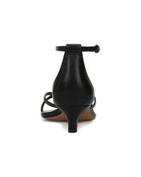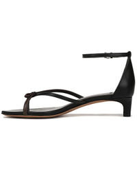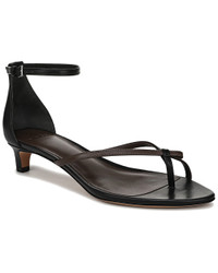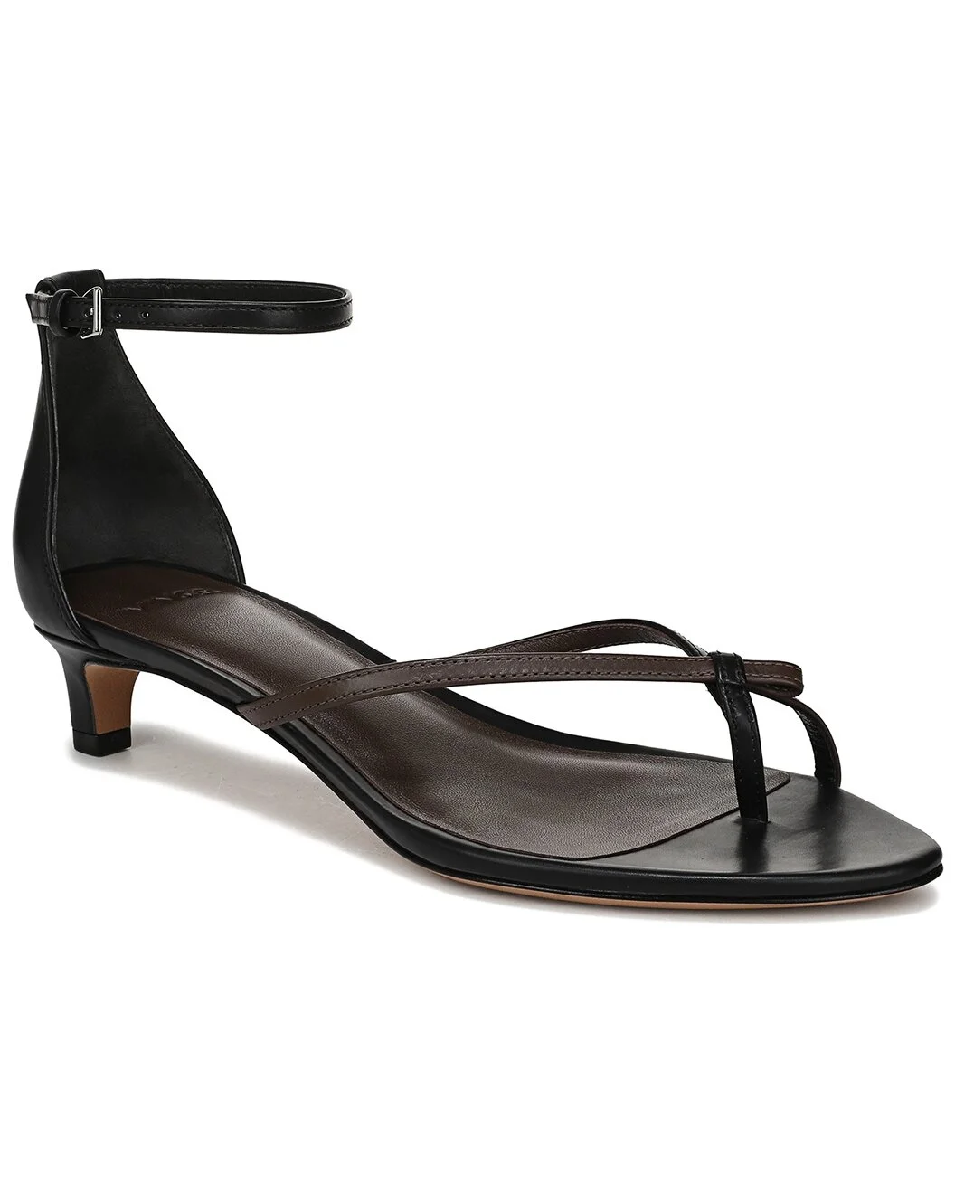 - About the brand: Inspired by the natural beauty of California, Vince is a master of simplicity and laid-back staples. From understated knitwear to tailored essentials, Vince's casual cool vibes are simply timeless. - Siri Leather Thong Sandal in black/brown leather - Buckle closure - Foam insole - Leather sole - 1.375in heel - Please note: All measurements are approximate and were taken from a size 6; slight variations may occur. - Imported