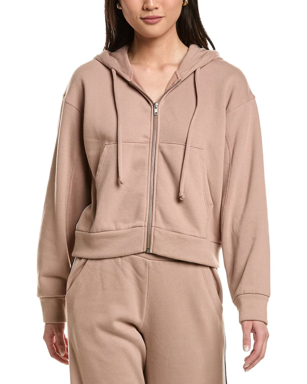 - Color/pattern: taupe/black - Approximately 22in from shoulder to hem - Model is 5'10 and is wearing a size small. Measurements may vary slightly by size. - Design details: divided kangaroo pockets - Zipper closure - 50% polyester, 38% cotton, 12% rayon - Machine wash - Made in the USA