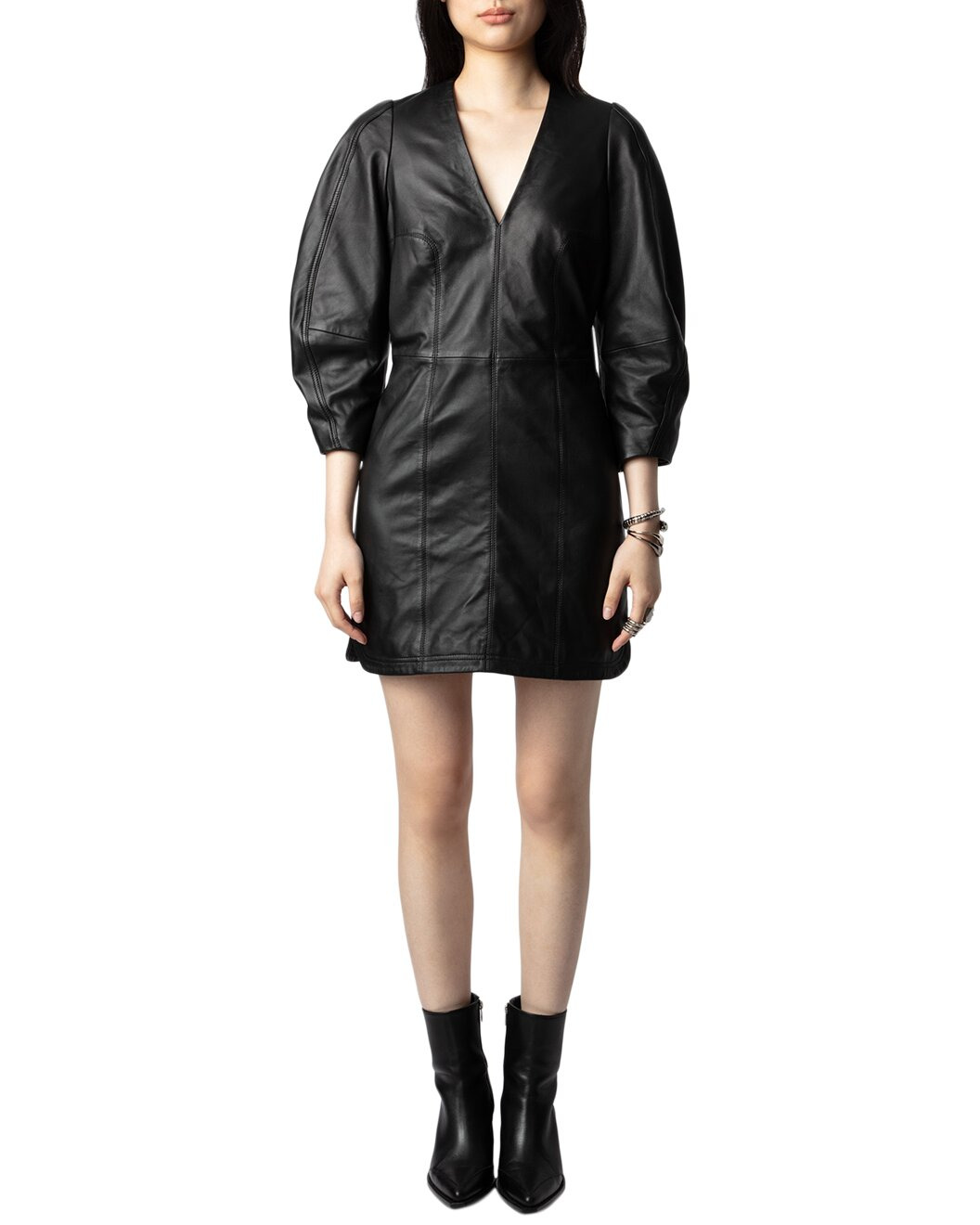 - About the brand: Zadig & Voltaire is a modern and edgy brand that plays with ambiguity in all areas of life. Based in Paris, the brand prides itself on individuality and self expression. Pulling inspiration from literary and art icons through the ages, Zadig & Voltaire embraces strength and inclusivity. - Dress in black - Design details: Black leather mini dress with full 3/4-length sleeves and belt at waist. - 100% sheep leather - Special leather cleaning - Imported