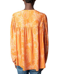 - About the brand: Zadig & Voltaire is a modern and edgy brand that plays with ambiguity in all areas of life. Based in Paris, the brand prides itself on individuality and self expression. Pulling inspiration from literary and art icons through the ages, Zadig & Voltaire embraces strength and inclusivity. - Silk Blouse in coral - Approximately 27.2in from shoulder to hem - Design details: Printed Henley blouse - Slip-on styling - 100% silk - Machine wash cold - Imported
