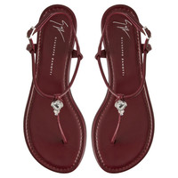 Product Details Flat thong sandals in leather with rhinestone detail, metal buckle-adjustable strap and leather-covered insole. - Burgundy leather - Silver-colored metal accessory with crystal-colored rhinestones - Heel height: 10 mm - Brown leather sole with logo ORIGIN: ITALY COLOR: BORDEAUX