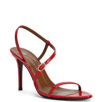 Product Details Reptile-print leather sandals with thin straps, metal buckles and stiletto heel. - Red reptile-print leather - Light golden metal buckle - 90 mm-high heel. - Brown leather sole with logo ORIGIN: ITALY COLOR: RED