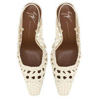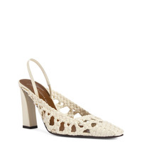 Product Details Slingback pumps in woven leather with square topline and toe, rear strap with elastic insert and block heel with metal stitch detail. - Ivory-white woven leather - 90 mm-high heel with light golden metal accessory - Brown leather sole with logo ORIGIN: ITALY COLOR: BEIGE