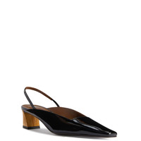 Product Details Slingback pumps in patent leather with square topline and toe, rear strap with elastic insert and knurled metal-effect chunky heel. - Black patent leather - 45 mm-high heel with gold-colored knurled metal effect. - Brown leather sole with logo ORIGIN: ITALY COLOR: BLACK