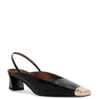 Product Details Leather slingback pumps with square topline and toe, hammered metal toe detail, rear strap with elastic insert and chunky heel. - Black leather - Gold-colored hammered metal toe accessory - Heel height: 45 mm. - Brown leather sole with logo ORIGIN: ITALY COLOR: BLACK
