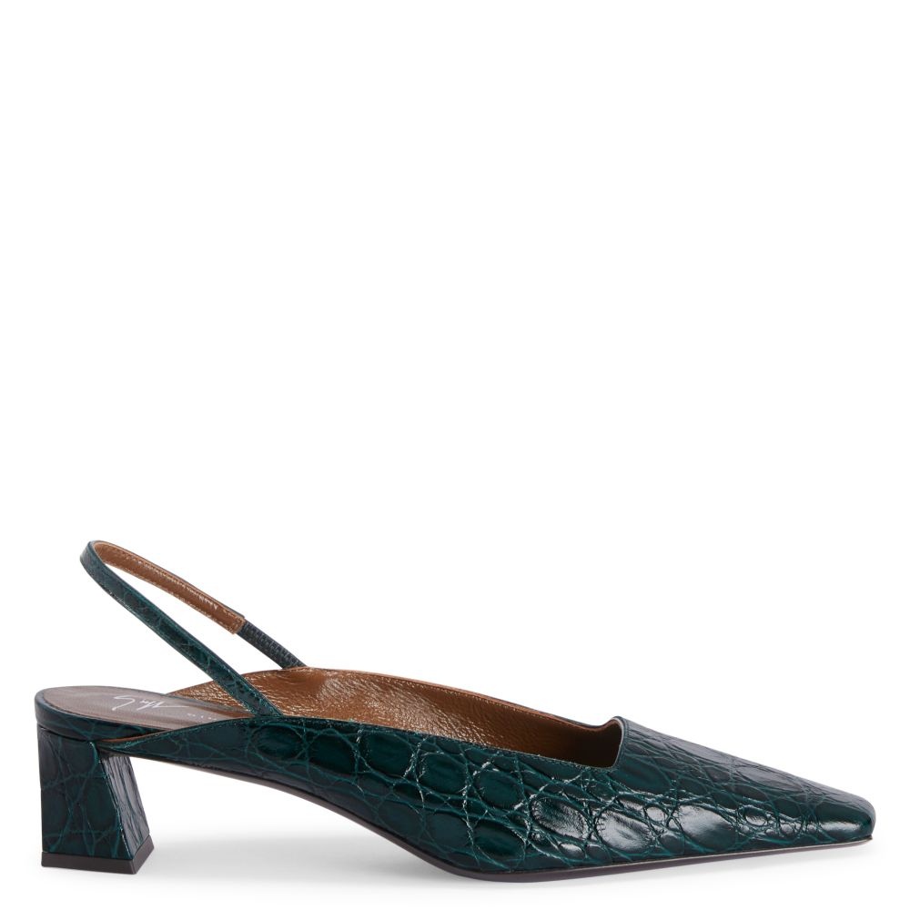 Product Details Slingback pumps in crocodile-print leather with a square toe and topline, a back strap with elasticated insert, and a kitten heel with a metallic detail. - Green crocodile-print leather - Light gold metal detail on the heel - 45 mm heel - Heel covered in green crocodile-print leather - Brown leather sole with logo ORIGIN: ITALY COLOR: GREEN