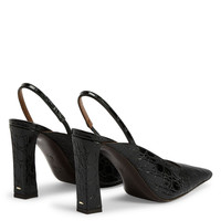 Product Details Crocodile-print leather slingbacks with square topline and toe, rear strap with elastic insert and block heel with metal detail. - Black crocodile-print leather - Metallic detail on light golden heel - Heel height: 90 mm - Heel covered in black crocodile-print leather - Brown leather sole with logo ORIGIN: ITALY COLOR: BLACK