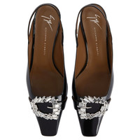Product Details Patent leather slingback pumps with square topline and toe, rhinestoned maxi buckle, rear strap with elastic insert and chunky heel. - Black patent leather and black leather - Silver-colored metal maxi buckle accessory and crystal-colored rhinestones - Heel height: 45 mm - Brown leather sole with logo ORIGIN: ITALY COLOR: BLACK