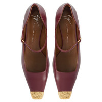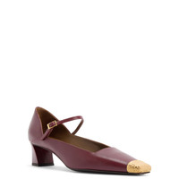 Product Details Mary Jane pumps in leather with square topline and toe, hammered metal toe detail and block heel. - Burgundy leather - Gold-colored hammered metal toe accessory and gold-colored metal buckle - Heel height: 45 mm. - Brown leather sole with logo ORIGIN: ITALY COLOR: BORDEAUX
