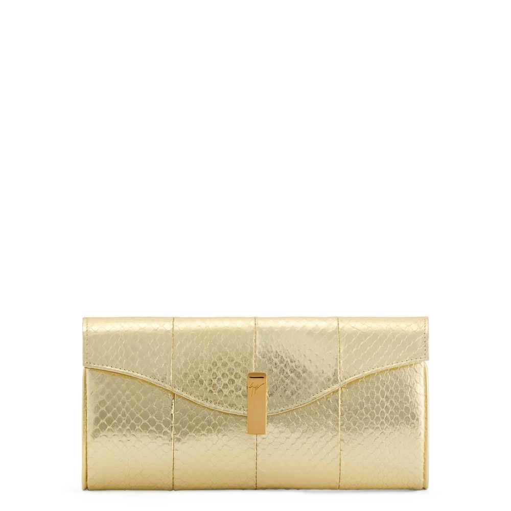 Product Details Clutch bag in reptile-print leather with branded metal closure, chain shoulder strap, pocket and inner card slots. - Golden reptile-print leather - Branded golden metal closure - Golden metal chain shoulder strap - Leather and fabric interior with card slots and pocket - Size: 230 mm x 120 mm x 30 mm ORIGIN: ITALY COLOR: GOLD