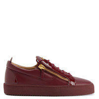 Product Details Low-top leather sneakers with glossy leather details, tonal laces, golden rubber-topped metal Signature detail on the tongue and matching side zippers on the upper. Tonal rubber sole. - Upper: 85% calfskin, 15% patent calfskin - Lining: calfskin - Insole: calfskin - Sole: Rubber ORIGIN: ITALY COLOR: RED