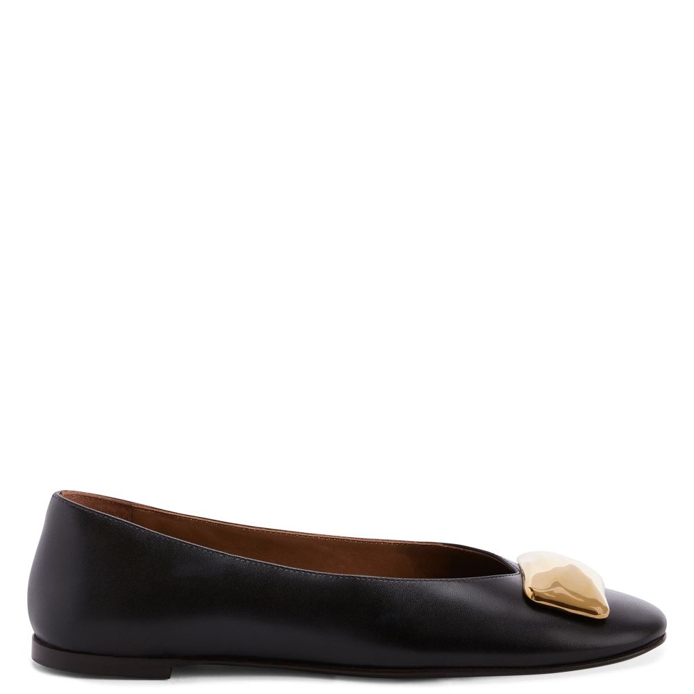 Product Details Leather ballerinas with geometric metal brooch. - Black leather - Golden metal accessory - 05 mm-high heel - Brown leather sole with logo ORIGIN: ITALY COLOR: BLACK