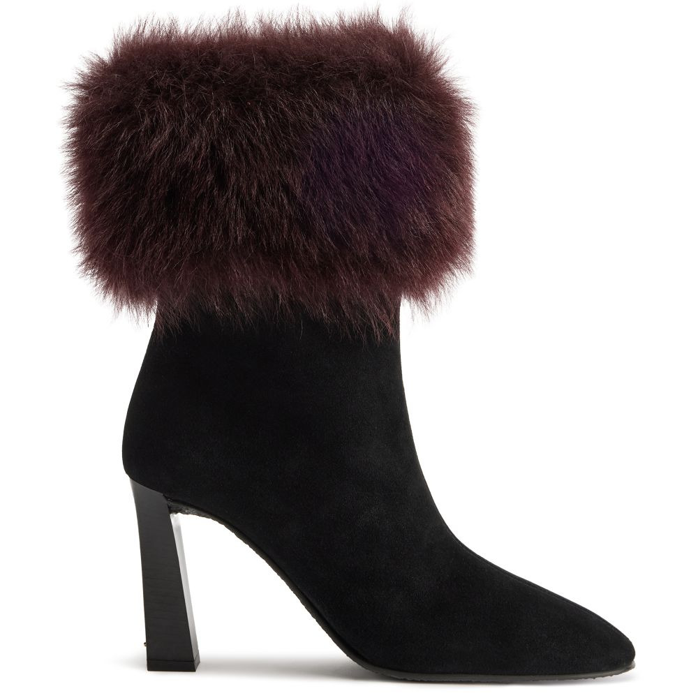 Product Details Suede ankle boots with contrasting fur cuff and block heel. - Upper: 80% goatskin suede, 20% - Lining: 80% wool - 20% NY - Insole: 80% wool - 20% NY - Sole: Rubber - Heel height: 90mm ORIGIN: ITALY COLOR: BLACK