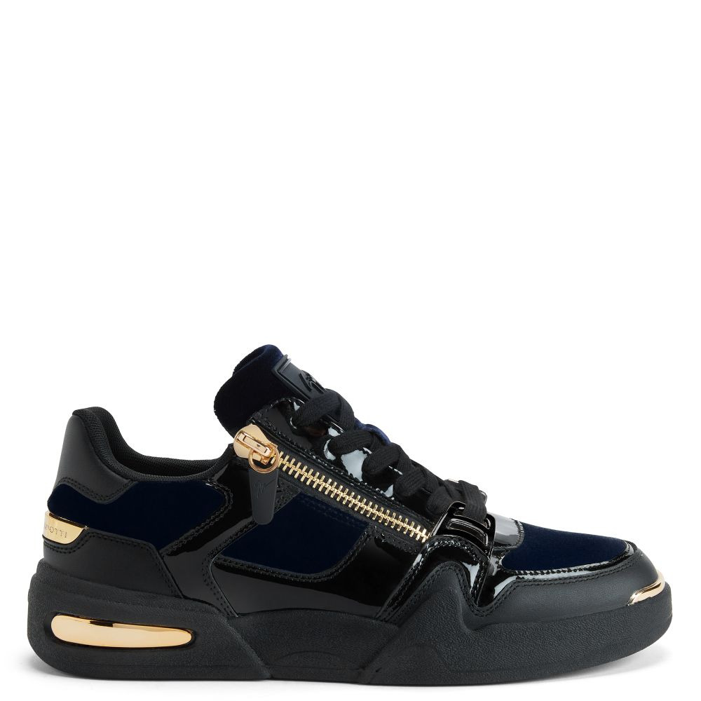 Product Details Low-top sneakers in leather, patent leather and velvet with two side zippers, golden details on the upper and outsole, and rubber sole. - Mens sneakers - Black leather, black patent-effect leather and navy-blue velvet - Black rubber-topped accessories, lace loop detail and golden heel detail - Black lacing - Gold-colored metal zipper detail - Black rubber sole with golden chrome detailing and logo ORIGIN: ITALY COLOR: MULTICOLOR